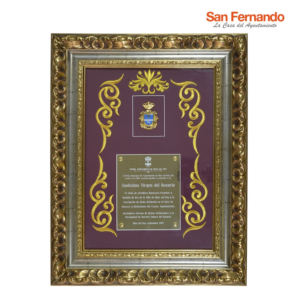 - Diseño elegante y solemne: marco artesanal con acabado dorado y fondo en terciopelo o tejido decorativo. Pensado para resaltar en actos protocolarios y espacios de honor.