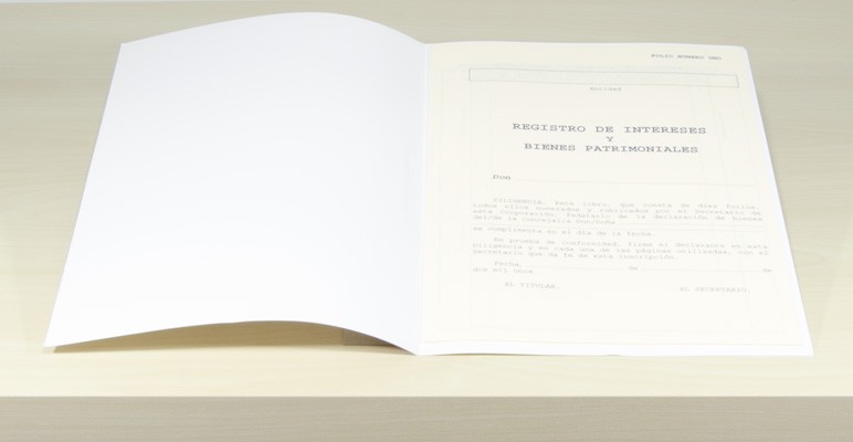 Descripción: Libro individual para cada Concejal de hojas móviles, no lleva encasillado, con el fin de no limitar espacios para la redacción y explicación a través de su ordenador. Una vez presentada la Declaración, el/la Secretario/a formará y encuadernará el libro que, después de diligenciar con el/a Concejal, quedará archivado en el Ayuntamiento, bajo la custodia del/de la Secretario/a. (art.30 Reg.O.F. y R.J. de las E.L.)