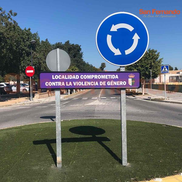 Señales de tráfico adaptadas con el objetivo de la sensibilización social y la prevención, realizando un llamamiento en la lucha frente a la Violencia de Género. Colocación en las entradas del Municipio / Ayuntamiento / Localidad / Ciudad mostrando su compromiso.